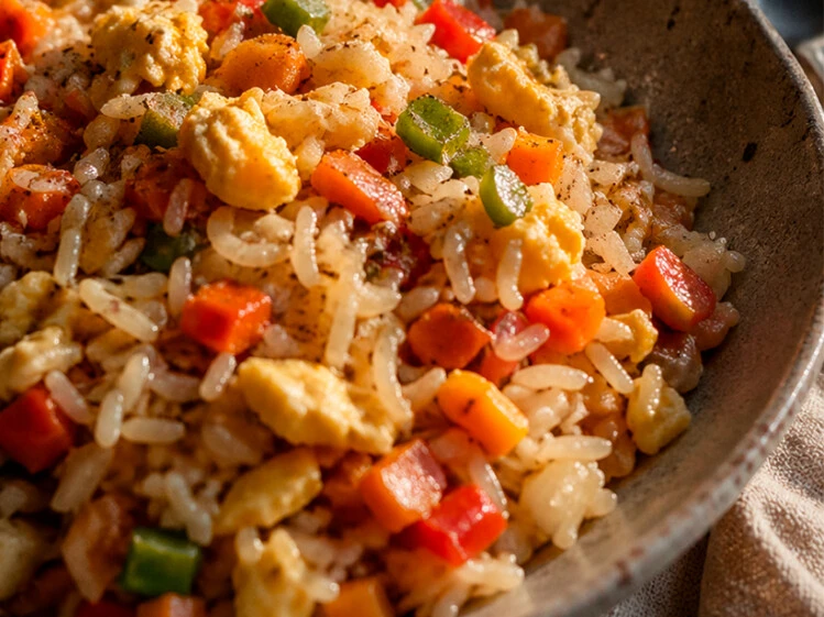 Plato principal: Arroz salteado con huevo y vegetales (tipo “arroz frito casero”)