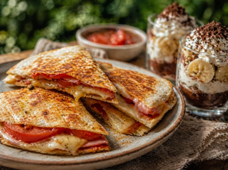 Plato principal: Quesadillas crocantes de jamón y queso con tomate