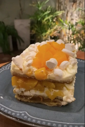 - Terminar con crema, duraznos y merengue.