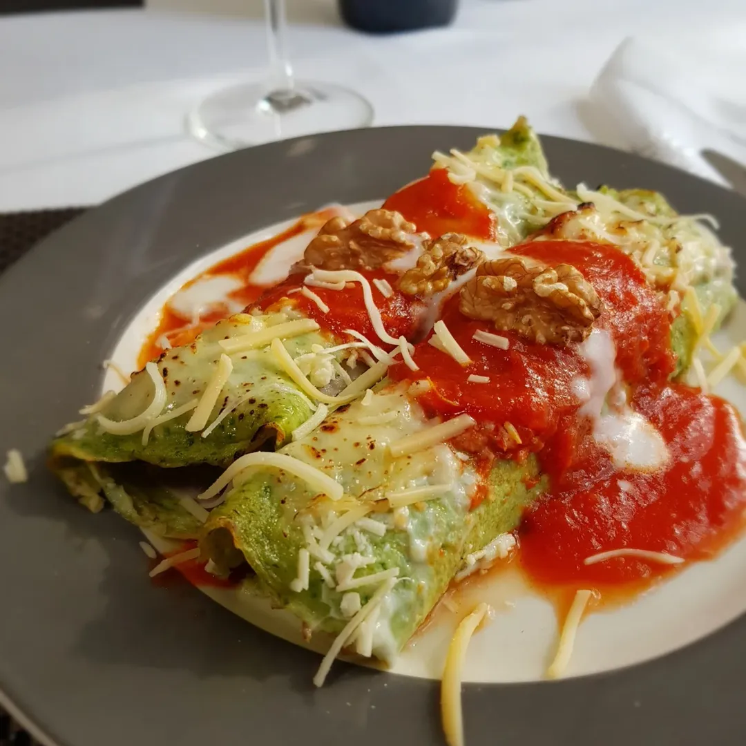 Canelones de espinaca con ricota, salsa fileto y blanca