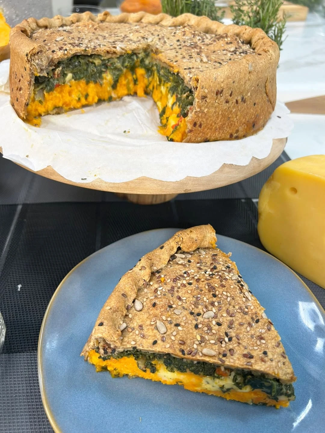 - Paso 5: Colocamos la primer tapa de tarta y espolvoreamos con el queso rallado. Luego sumamos el relleno de calabaza debajo, cubrimos con la muzza rallada y por arriba colocamos la acelga. Sembramos unos tropezones de queso azul.
