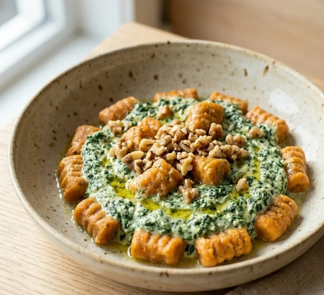 Ñoquis de batata con salsa de espinaca y nuez
