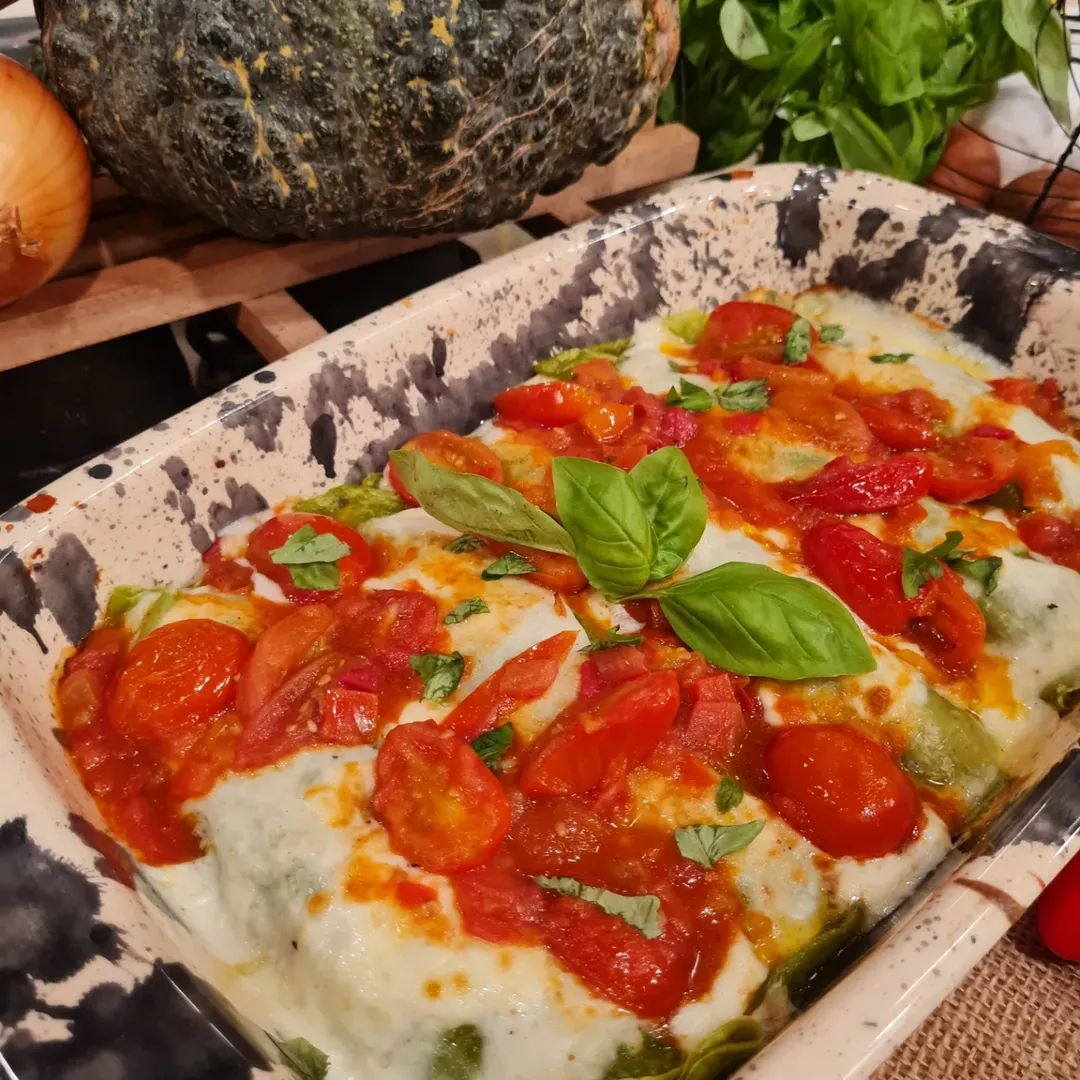 Canelones de espinaca rellenos de calabaza y ricota, salsa blanca y tomates cherry dorados