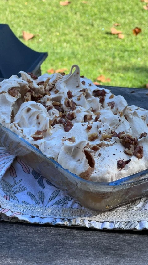 - Cubrir las manzanas: Verté el merengue sobre las manzanas y espolvoreá las nueces por encima.