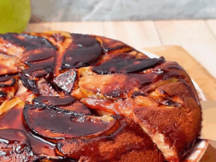 Paso 7: Pasado el tiempo, revisá que la torta esté firme y cocida. Dejala enfriar apenas un poco antes de desmoldarla sobre un plato. ¡Listo! Ya tenés una torta invertida de manzana, fácil y saludable (link interno a nota sobre postres fit de la semana).