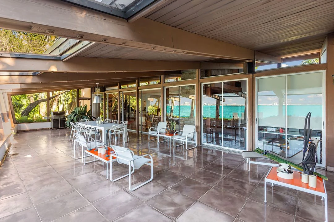 De techos altos y con múltiples ventanas que la abren de un lado hacia los frondosos jardines y del otro hacia la Bahía de Biscayne y el mar azul de la costa de Miami, la nueva casa de vacaciones de la pareja ocupa alrededor de media hectárea.