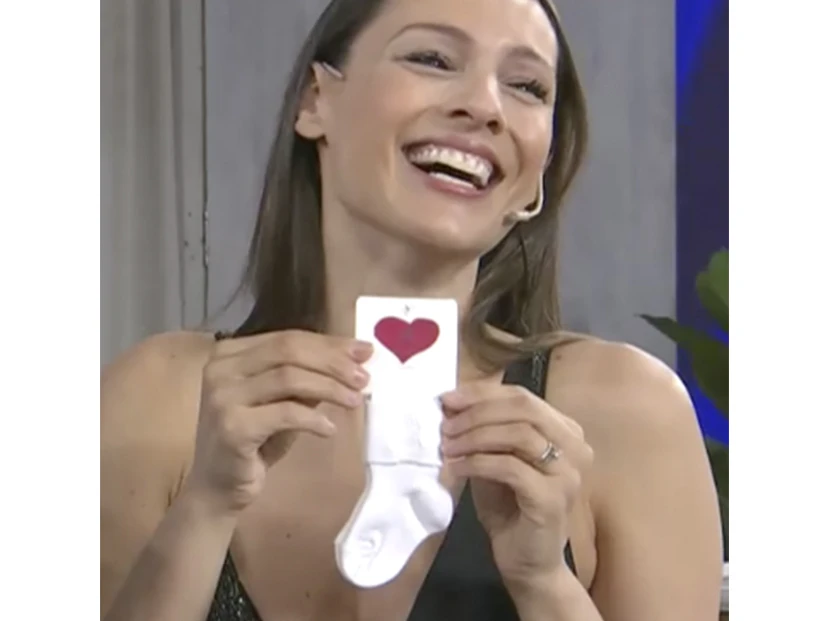 Y Pampita con ingenuidad le respondió: "¡Qué lindo! ¿Esto mandó? Para mí. Hay muchas mujeres en este programa... ¿Vos decís que de acá a marzo es por algo?, le preguntó mostrando a la cámara un par de medias blancas de bebé.