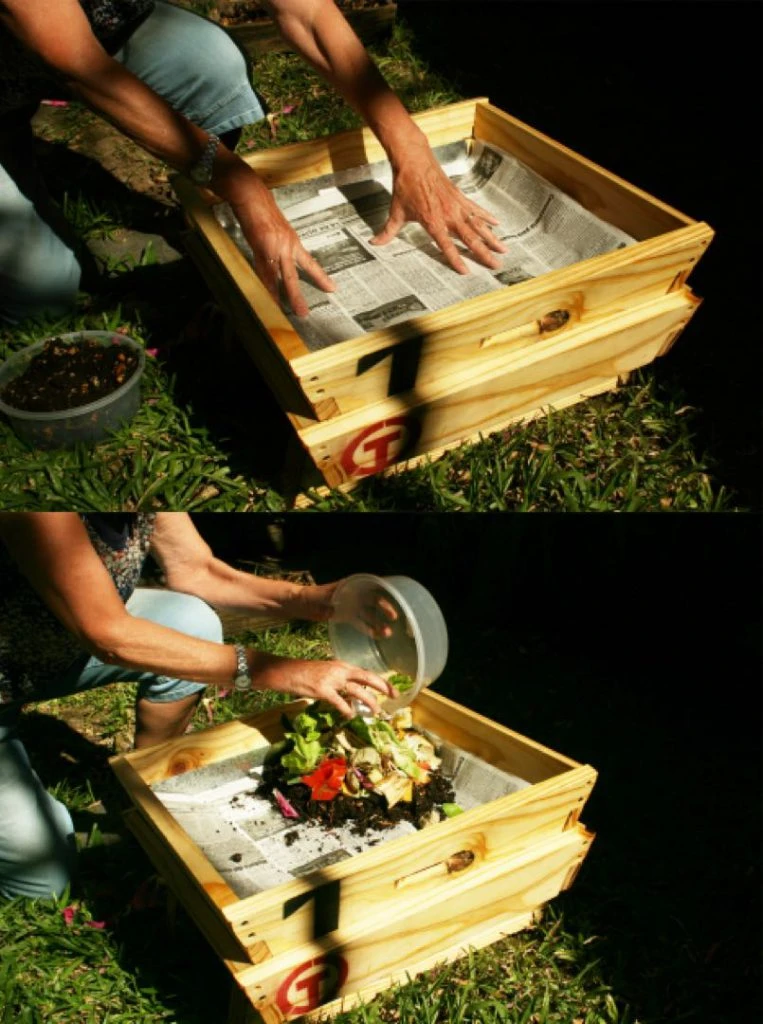 - Activá la compostera: Ubicá la compostera preferentemente al reparo de la lluvia y del sol directo. Disponé dos o tres hojas de papel de diario sobre la base del módulo Nº1 como lo indica la imagen. Depositá, sobre esta capa de papel, cuatro o cinco tazas del material de activación (compost); esto activará la compostera y la dejará lista para recibir tus primeros orgánicos en su etapa inicial. Para incorporar lombrices te recomendamos esperar al menos 45 días.