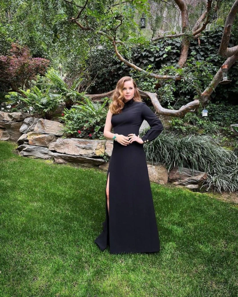 Amy Adams, lleva un vestido de escote irregular y abertura en la falda, que es una creación de Celine.