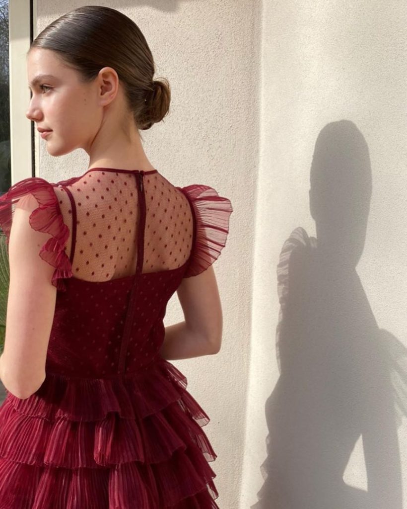 Hunt, en lo que fue su primera participación en la entrega de premios, eligió una delicada pieza de Red Valentino. En un tono vino tinto, la pechera está realizada en plumetí, con volados en las sisas y transparencias. La falda está compuesta por volados de tul en el mismo tono.