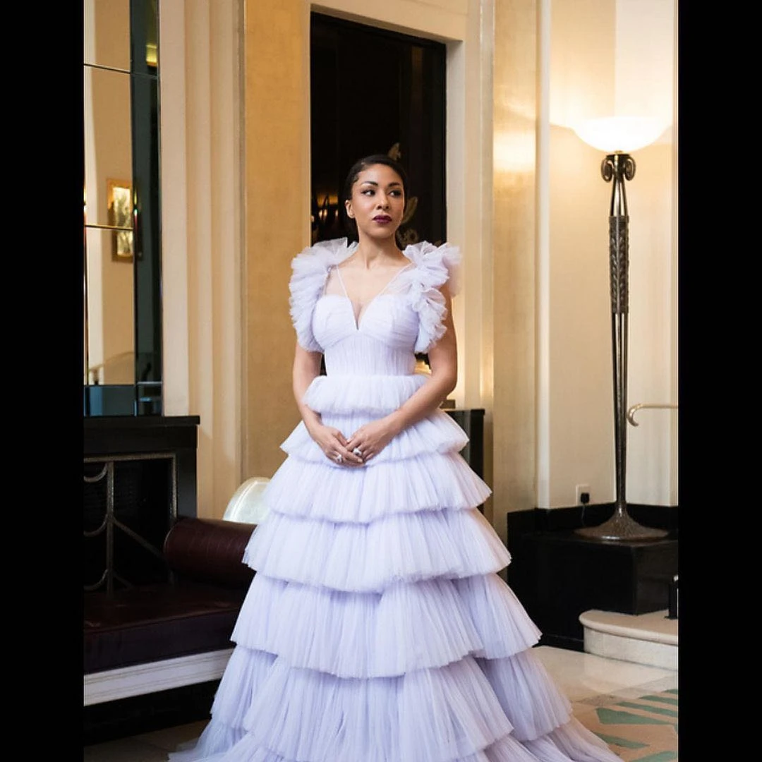 Un sinfín de capas de tul componen este vestido con volados en las sisas y también en la falda, desde la cintura hasta los tobillos.