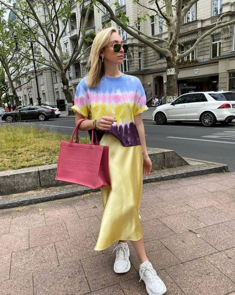 En contraste con los géneros rústicos, las faldas también se usan en satén. Y el brillo se contrasta con zapatillas.