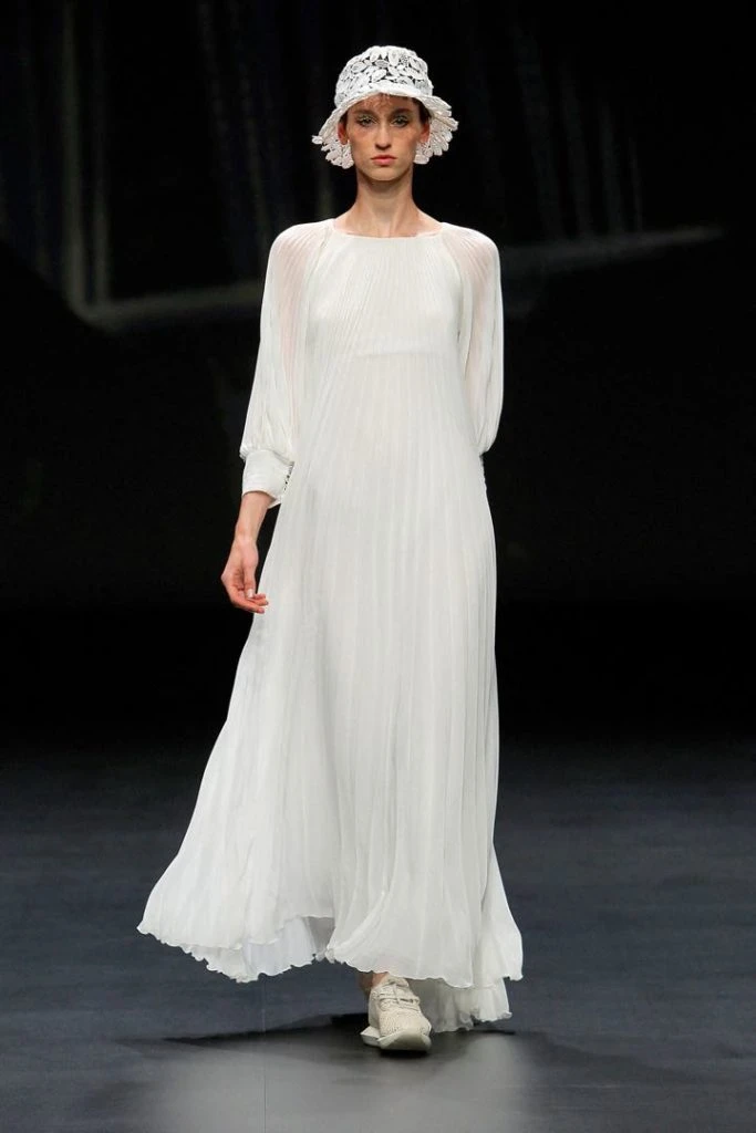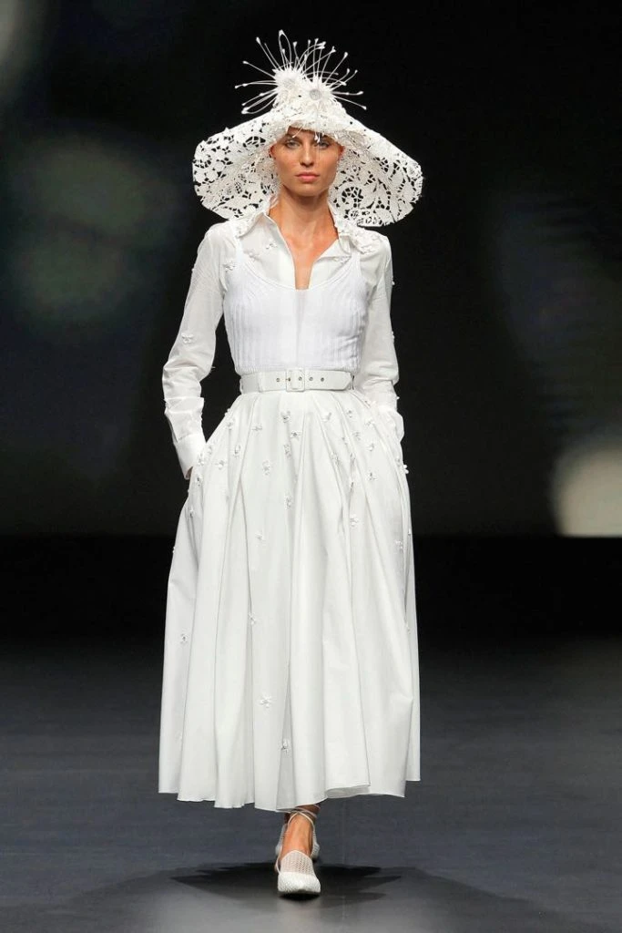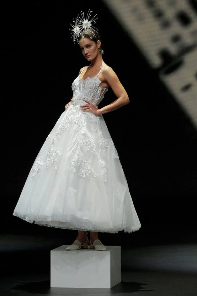 Auténticas piezas artesanales, con tejidos nobles. Vestidos de novia con manga larga, los estilismos con faldas estructuradas y voluminosas, o los diseños con escotes pronunciados. Diseños para todos los estilos. Así fue la propuesta para novias de Yolancris en la pasarela de la Semana de la Moda de Barcelona.