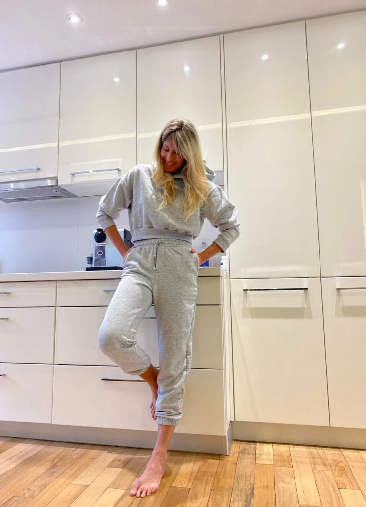 Porque a Sole también le gusta estar cómoda en casa, eligió este conjunto de jogging gris (Freya). Pero no es cualquier jogging: tiene la particularidad de llevar el buzo corto a la cintura. Un detalle que le suma mucha onda al look.