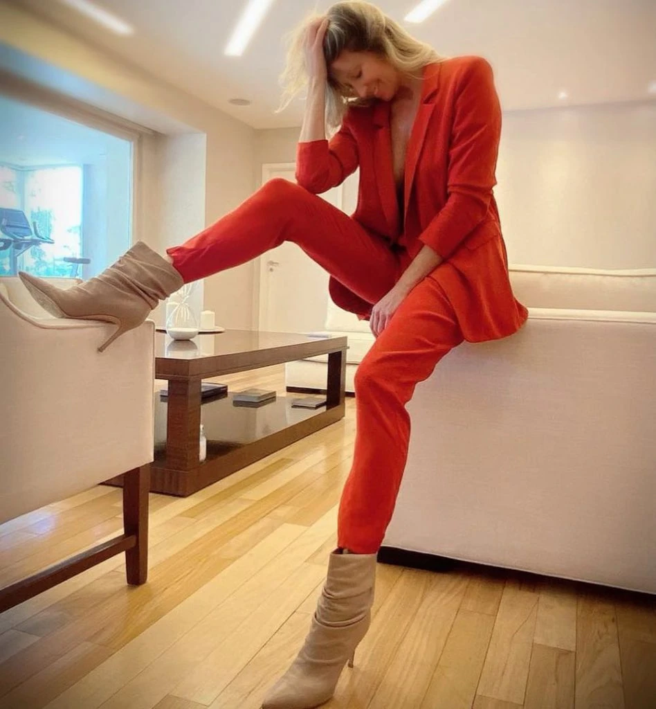 Los trajes sastreros con botas son la última tendencia este invierno. Sole Solaro lleva uno en color rojo y con cintura alta, de Pía Carregal. ¿Quién diría que algún día íbamos a usar los trajes así, con botas? Esta vez la modelo eligió unas botas de gamuza cortas arena, de Gianvito Rossi.