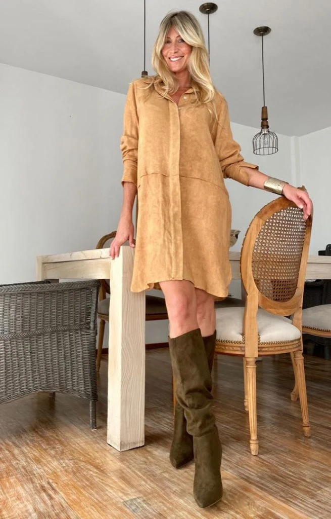 Sole eligió una camisa tipo mini vestido en gamuza en color camel. Un diseño muy cómodo y canchero, especial para estar arreglada y usar en casa durante la cuarentena. Lo combinó con botas altas en punta también de gamuza en color marrón.
