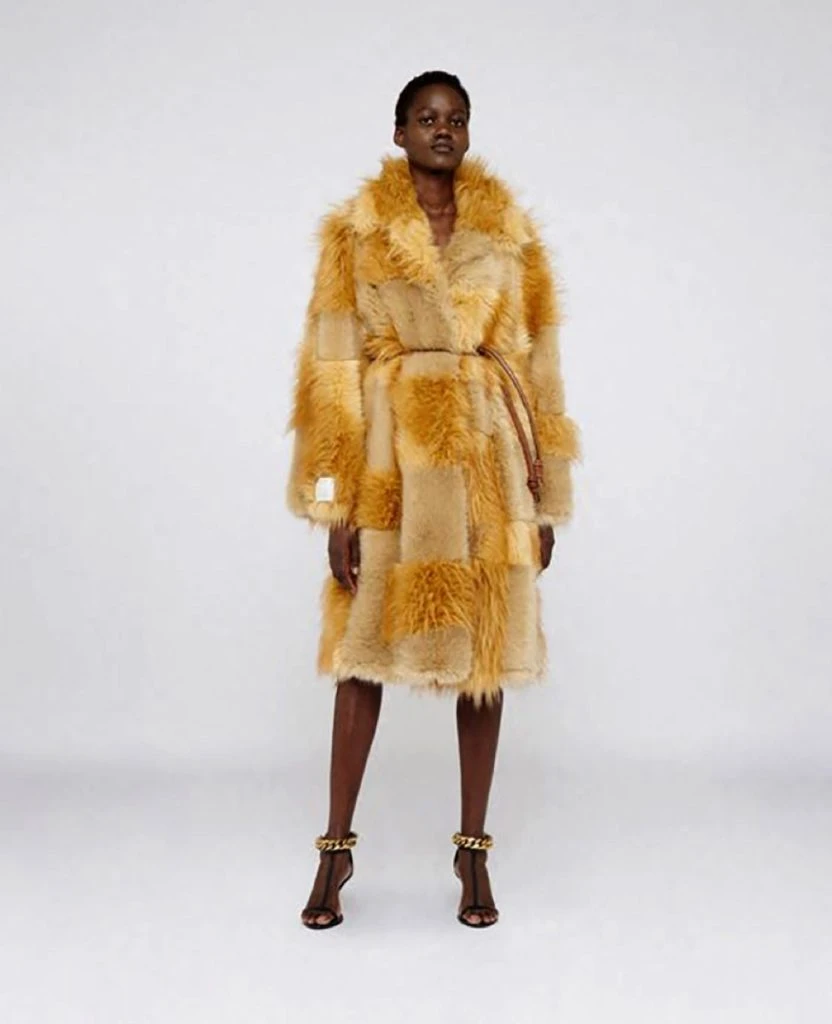 Otra de las piezas que más se destacaron fue un abrigo de piel sintética patchwork, elaborado con varios retazos de tela. Una creación única que hará que tus looks marquen la diferencia.