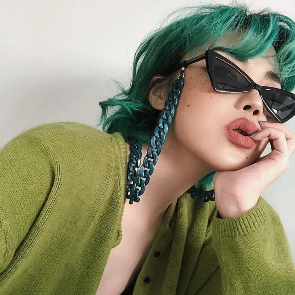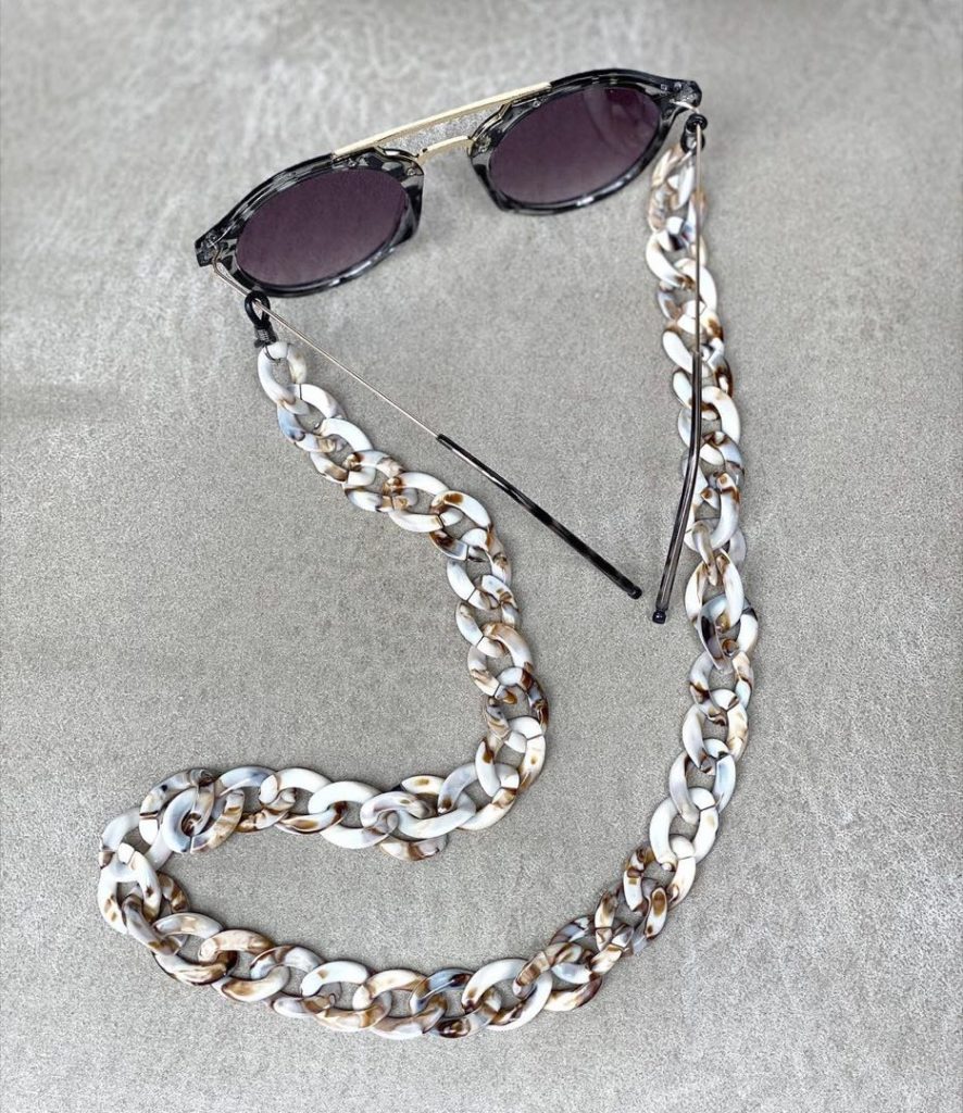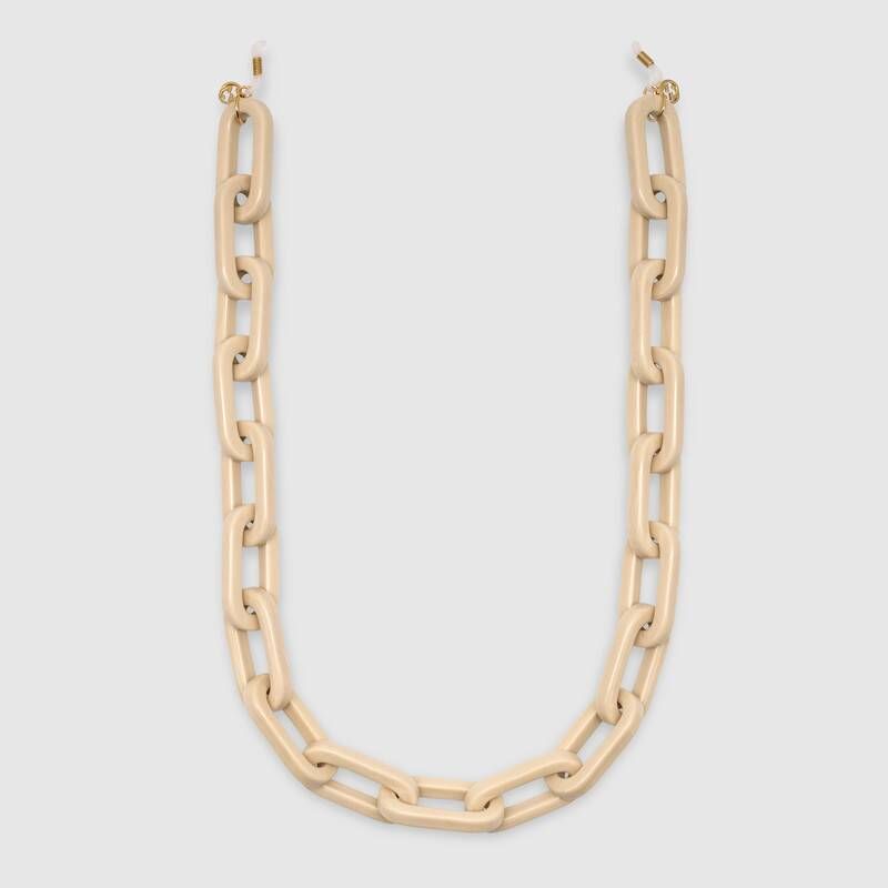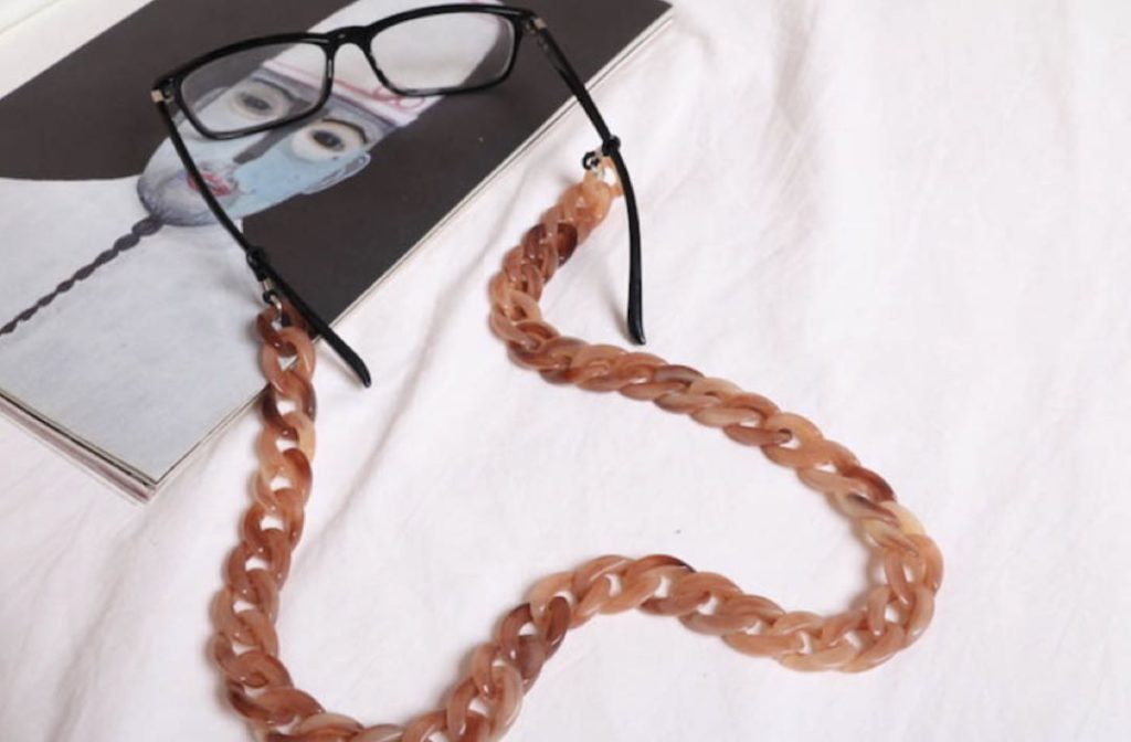 Ya lo sabés, nada de hilos, cuerdas, tiras o bordados, este año los lentes se cuelgan de cadenas, preferentemente de plástico, para que sean más cómodas de llevar y no estropeen la ropa.
