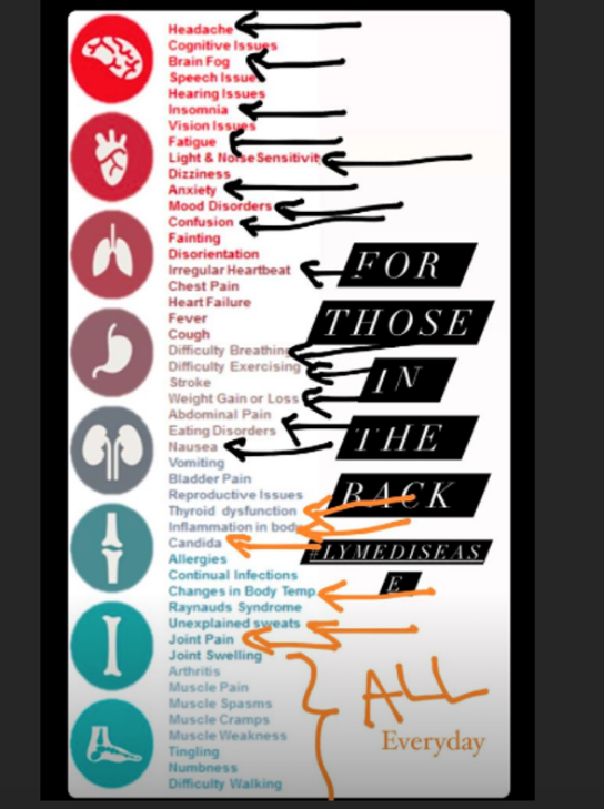 Algunos de los síntomas que presenta la enfermedad son: Palpitaciones irregulares, dificultad al respirar y hacer ejercicio, pérdida de peso o aumento de éste, dolor abdominal, naúsea, disfunción tiroidea, inflamación corporal, candidiasis, cambios en la temperatura corporal, sudor inexplicable, dolor o inflamación de articulaciones y artritis, fatiga.