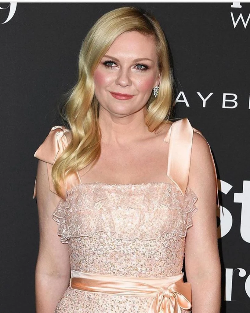 - Volados y colores pastel. Kristen Dunst llevó un vestido largo de colores pastel, con pequeños volantes de tul en escote y falda, y cinturón de raso con breteles a tono.