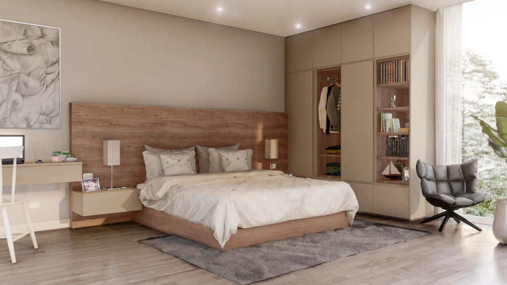 Fiel al estilo de decoración nórdico que está cada vez más en auge, la melamina Himalaya (línea Étnica) es un aliado indiscutible para sumar luminosidad y calidez al ambiente. Fusionado con la melamina Báltico (de la línea Nórdica), genera un ambiente versátil, en el que comparten protagonismo ambas texturas.