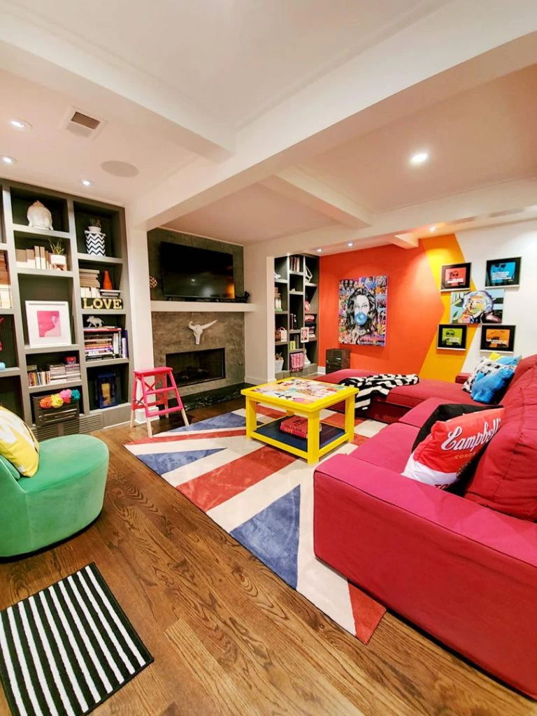 EL FAMILY ROOM. Es un ambiente con detalles súper interesantes, como la alfombra con la bandera inglesa (comprada por Amazon) y los murales pintados por Paola: rayas en blanco y negro sobre fondo rojo en un caso, y un degradé de flechas en naranja y amarillo en el otro.
