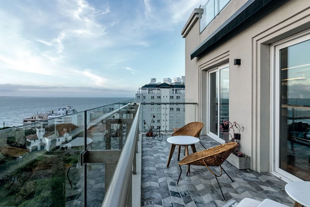 "El departamento está implantado en un edificio que tiene una amplia mirada al mar y de un lado y del otro. Por eso disfruta tanto de los amaneceres en el mar como de los atardeceres en la ciudad. Aprovechar esas vistas y conectarlas con todos los espacios fue nuestro principal objetivo", dicen las responsables de la ambientación. En esta toma del amplio balcón con baranda vidriada y pisos calcáreos combinados http://baracemento.com.ar), dos poltronas de mimbre y una mesita con tapa de madera laqueada (http://@sokamarket).