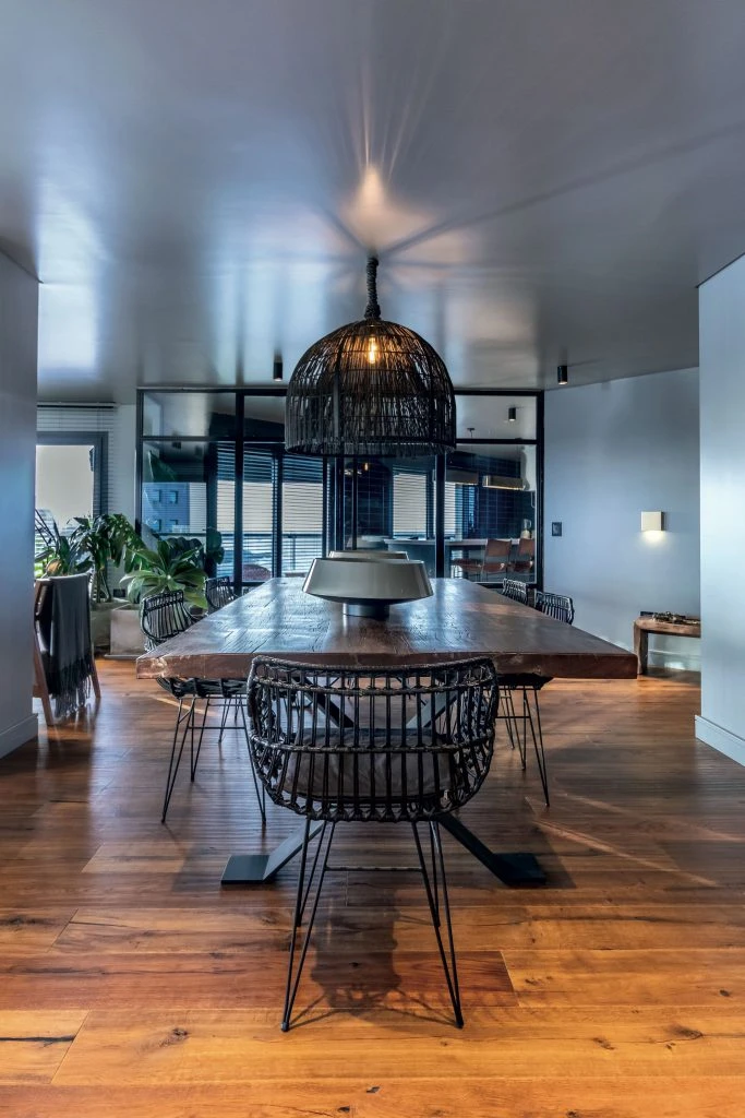 El comedor arma una exitosa sociedad entre unos silloncitos con estructura de hierro, una mesa de lapacho con patas de hierro y las pantallas de mimbre de las lámparas que caen sobre ellos para iluminarlos. (todo de http://www.negrohouse.com). "El diseño interior fue concebido buscando espacios cómodos, funcionales, simples y amigables para recibir a grandes y chicos", dice Zunino. "Los dueños de casa conservaron muebles que tenían y nosotras completamos con otros para lograr el objetivo buscado".