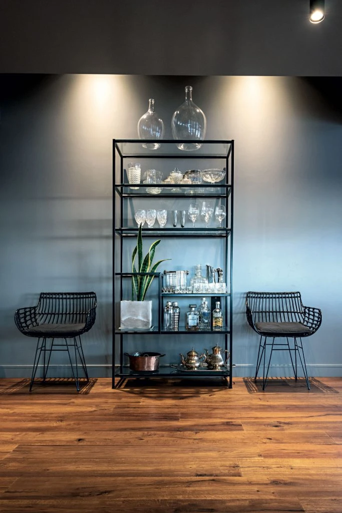Junto al comedor, el bar -con su cristalería y botellas- encuentra lugar en una biblioteca diseñada por el estudio con varas de hierro negro y estantes de vidrio. El modelo contempla un estante especialmente adaptado para ubicar una maceta con Sansevieria trifasciata. Dos sillas auxiliares se plantan a cada lado, a mano para cuando se suman comensales.