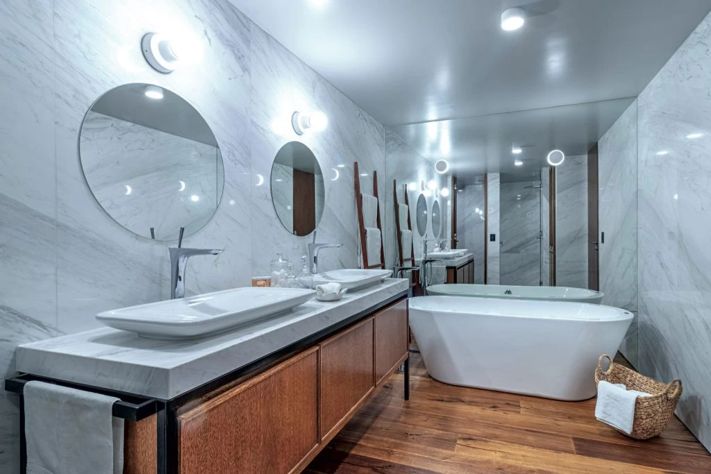 El baño principal se proyectó compartiendo las zonas de ducha y sanitarios. El espacio consigue una amplitud aún mayor por la elección del revestimiento integral de mármol Volakas para mesadas y paredes y por el muro espejado que da respaldo a la bañera Starck exenta (http://la.duravit.com). El muebles bajomesada tiene estructura de hierro y puertas de madera maciza, mientras las dos bachas de apoyar (Duravit) llevan griferías monocomando Pura Vida (http://www.hansgrohe-la.com) y sendos espejos circulares. Atrás, los cubículos de ducha y sanitarios se ubican en un extremo de la composición, junto a un mueble de guardado realizo a medida en madera.