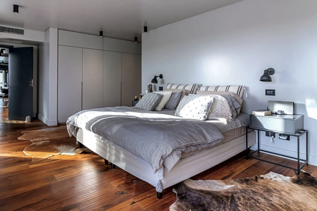 "En el cuarto principal continuamos con el criterio de mantener la caja neutra, por eso diseñamos lugares de guardado con puertas en el mismo tono de los muros, para que no destacaran. El respaldo de cama es al mismo tiempo el muro contenedor de una parte del vestidor y el divisor que da acceso al baño" cuenta Zunino. La cama y las mesas de luz (Söka Market) se iluminaron con apliques de pared mientras que para el ambiente en general se eligieron spots de techo (http://iluminacionaguero.com).