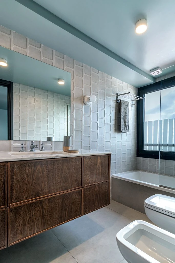 Los baños de los niños recibieron los mismos revestimientos en muros y pisos. El piso recibe un porcellanato gris de gran formato, el revestimiento de pared es un cerámico mate con efecto 3D (modelo Plaza HD de http://ceramicaportinari.com.br) y el mueble de madera suspendida tiene mesada de mármol y grifería Vermont (http://www.fvsa.com).