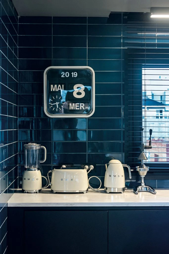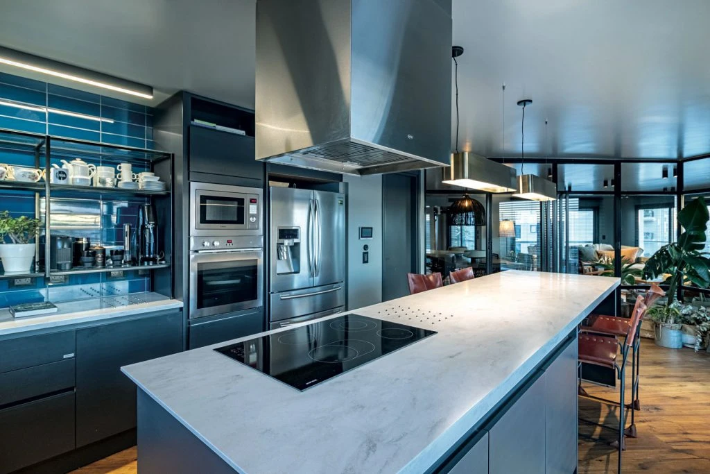 Una gran isla con mesada de Corian domina la composición de la cocina, con mobiliario diseñado por el estudio y fabricado por Johnson Amoblamientos (http://johnsonacero.com). La propuesta combina muebles con frentes grises laqueados con bibliotecas de hierro negro (estudio Zunino-Grillo) que apoyan directamente sobre las mesadas. La iluminación está definida por unas lámparas colgantes Grisin de bronce empavonado (http://www.lafeliz.com). La campana, el anafe y todos los artefactos (http://www.glemgas.com) contribuyen con la imagen industrial del espacio.