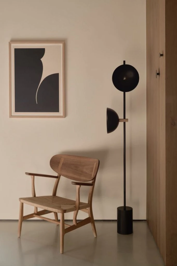 La escultórica lámpara de pie Studio cuyo diseño se inspira en las lámparas fotográficas tradicionales (www.handvark.com/) hace el match perfecto con el icónico sillón danés CH22 de Hans J. Wegner en nogal, roble y asiento de fibra natural (https://www.carlhansen.com/).