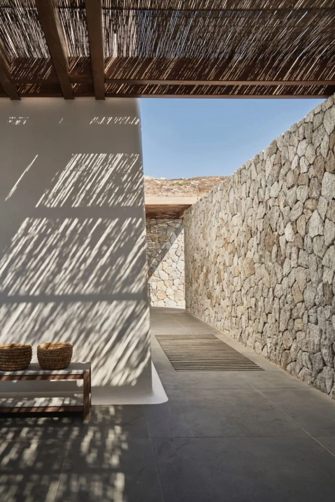 Hacia el otro lado del jardín, se instalaron muros construidos a mano con piedras locales (tal como se hacía tradicionalmente en la arquitectura cíclada) que protegen las áreas de descanso de la carretera cercana, a la vez que anclan la propiedad en el paisaje rocoso.