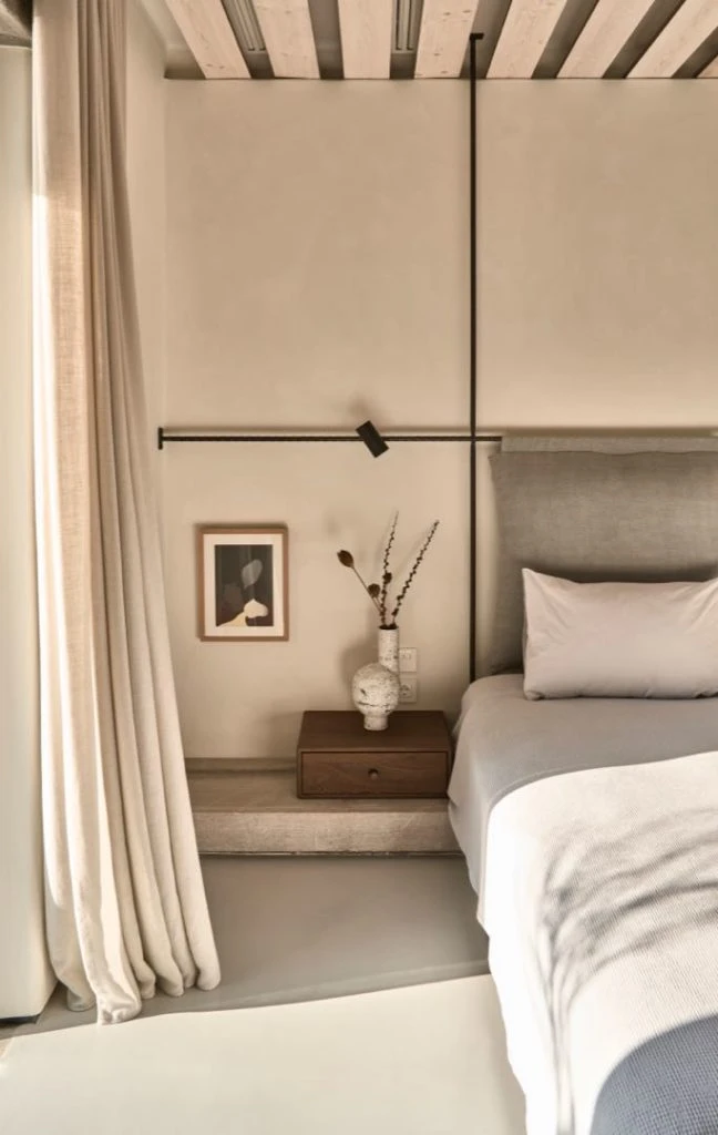 Las mesas de luz están hechas de armarios de madera que descansan sobre nichos de piedra, mientras que los veladores de pared (https://siilight.com.au/) acompañan la sobriedad y las líneas simples de los elementos de cada espacio.