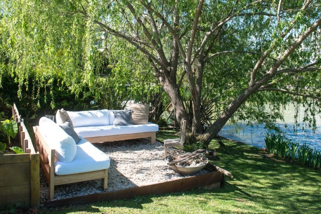 Utilizando los desniveles naturales del terreno, se construyó un talud de hormigón armado para contener el solarium, y a la sombra del sauce, se instaló un living exterior con las mejores visuales al lago, con dos sillones modelo Acapulco.