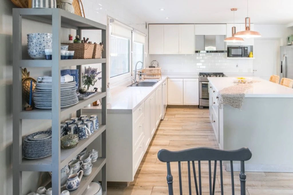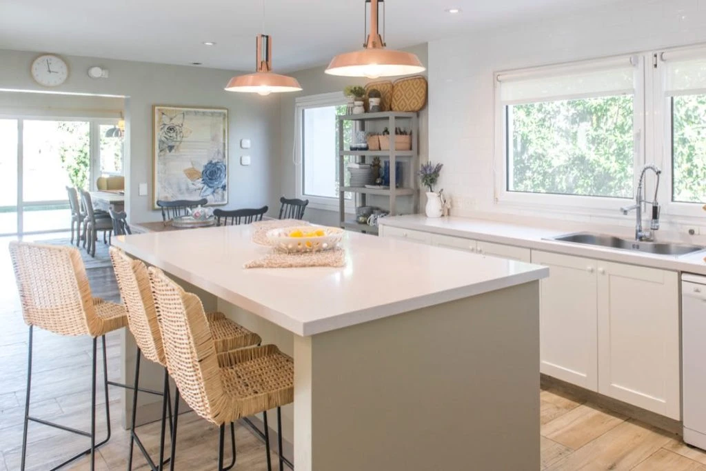 Las lámparas galponeras colgantes son de cobre y las sillas de mimbre le aportan calor de hogar al total white elegido para este espacio.