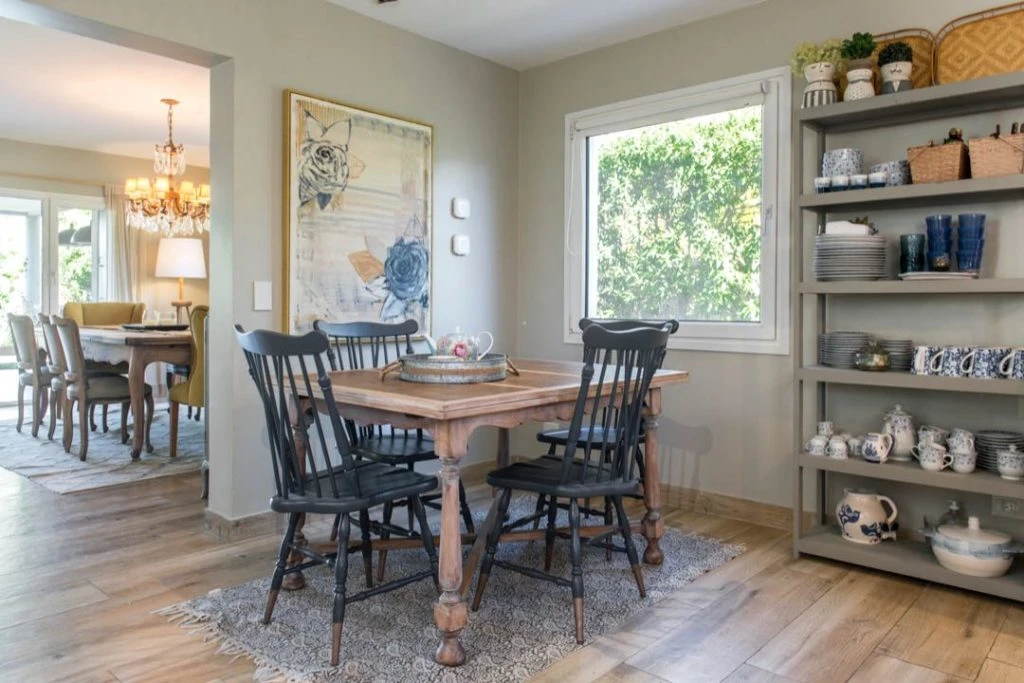 Una gran mesa de comedor y sillas de estilo francés totalmente reciclados. Y el detalle de la araña colgante francesa con caireles y pantallas de lino.