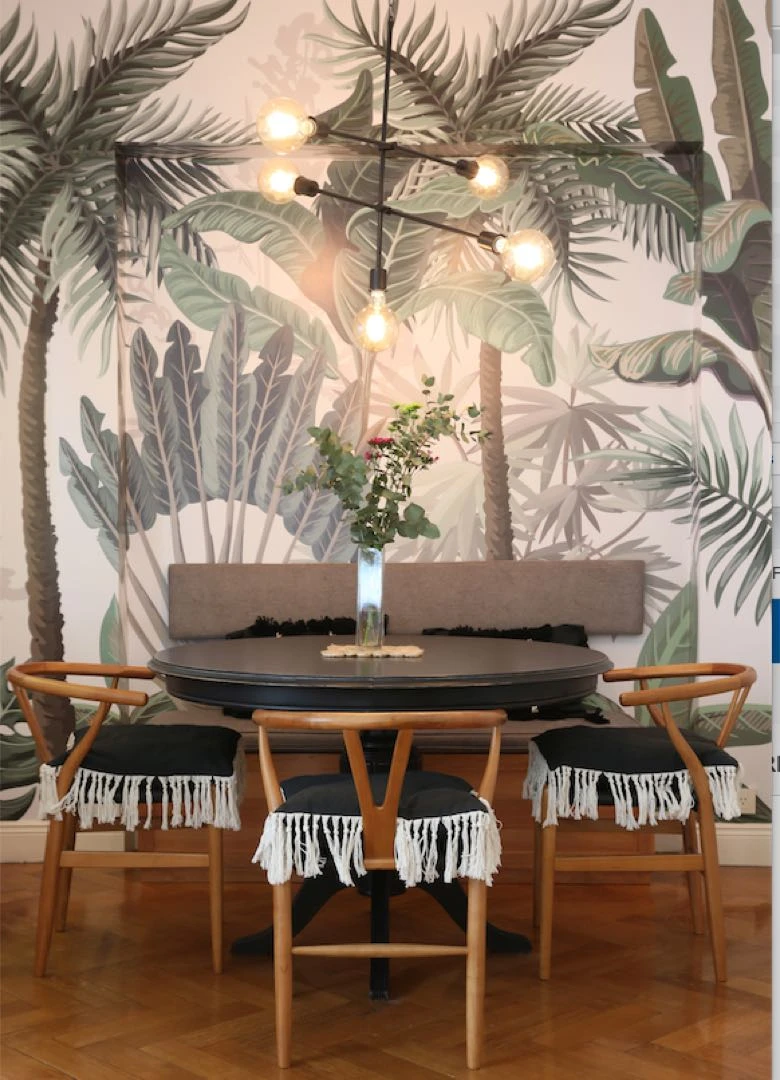 “El mural del comedor, lleno de palmeras y strelizias me hacen sentir de vacaciones todo el año”