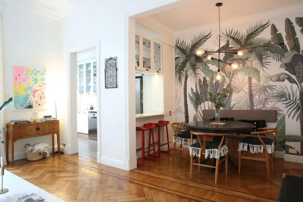 El espacio ganó una personalidad cautivante con un mural de palmeras y sterlizias (@sociedadde2) que le da un respaldo extra a la mesa restaurada con pátina negra, las sillas Wishbone (@deciropalermo) y el banco con respaldo y espacio de guardado (@bughadisegno). Lámpara colgante (@holacasatilia). Dos banquetas rojas se arriman hacia la barra de la cocina integrada.