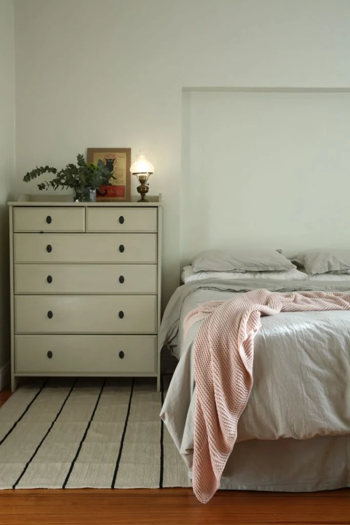 El dormitorio principal es un descanso en todo sentido: un cuarto minimalista, con lo justo y necesario. El ambiente sólo fue modificado para robarle unos metros que fueron cedidos al baño en suite. Se destacan la cómoda (Ikea), el acolchado gris perla (@ dearrietastore), la manta tejida rosa (H&M Home) y la alfombra (@mewadeco) .