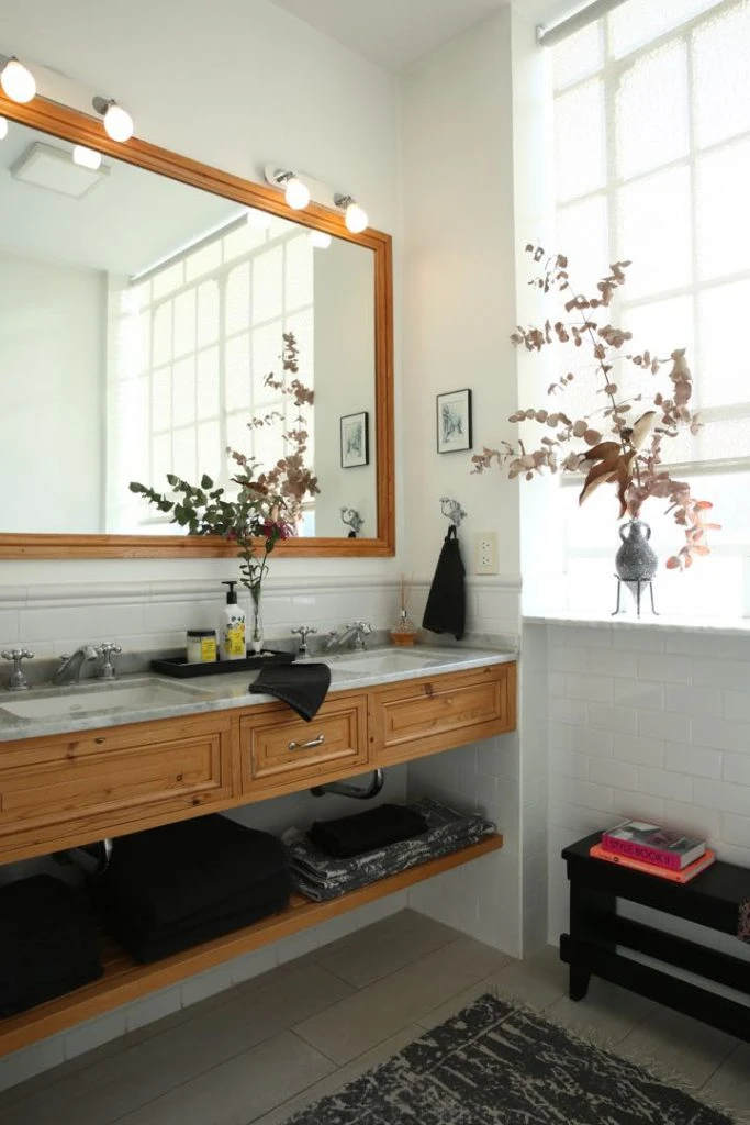 El baño principal se respalda en un gran ventanal de vidrio repartido, original de la casa. Diseñado en blanco, negro y madera (un trío que no lo ata a una moda en particular) remata en un gran espejo con marco de madera.