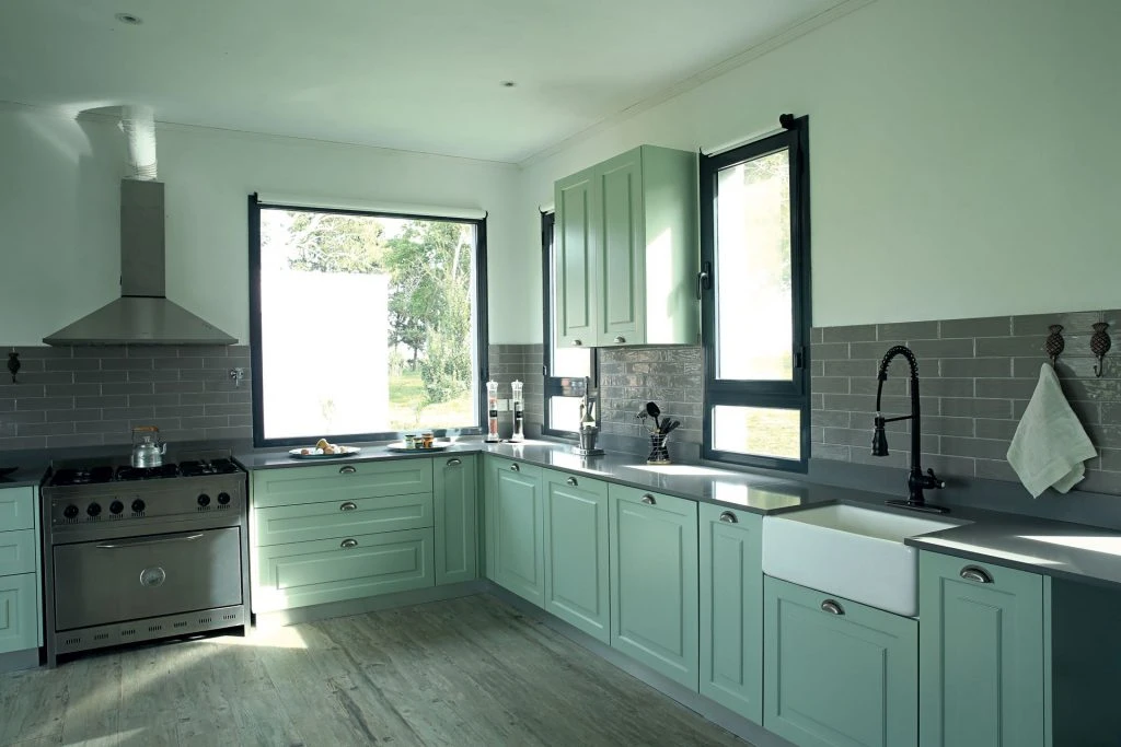 La amplia cocina también replica la atmósfera de antaño con muebles en verde de estilo country laqueados en verde celadón y una pileta de acero (www.ferrum.com) con grifería monocomando negra. Aunque son bien modernas, las mesadas de Silestone gris no desentonan porque se emparentaron con la alzada de cerámicos subway al tono. Todos los accesorios de cocina se compraron en el exterior (http://www.mackenzie-childs.com).