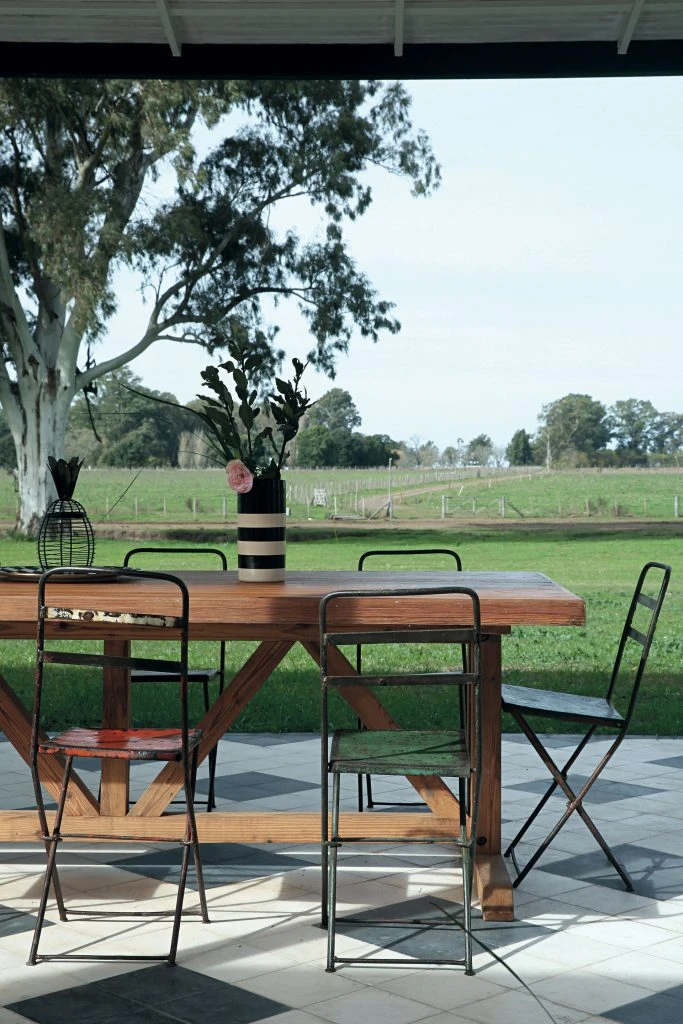 El contrafrente de la casa, pintado de rosa, se abre al campo. Allí se construyó esta galería con techo de madera y chapa sostenido por columnas de hierro con el objeto de dar resguardo al comedor y el estar de exterior. Bajo su sombra y ubicados sobre el piso granítico colocado en damero descansan dos sillones de hierro y una banqueta tapizada alrededor de una mesa de madera, parcialmente visibles tras el juego de comedor.