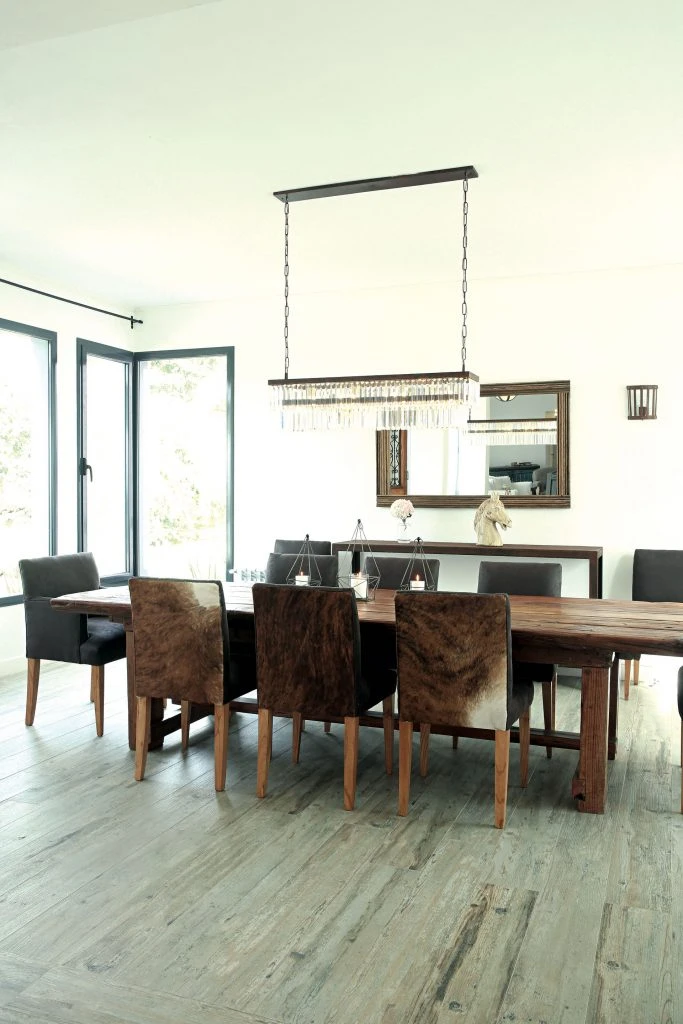 Una imponente mesa de madera de lapacho reciclado (Carlos Cherri) pisa fuerte en el comedor. Decorada con tres fanales de hierro (Lo de Berni), se acompañó con sillas usadas que se retapizaron en cuero de vaca y pana (delevie.com.ar) para remarcar la impronta del campo argentino. Una lámpara colgante rectangular la ilumina cenitalmente (Agustina Cerato), mientras detrás asoma una consola de hierro óxido destacada por un espejo y apliques de pared de hierro (todo de Lo de Berni).