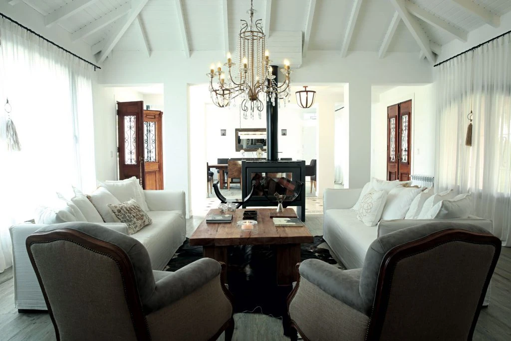 El living y el comedor se ubican en ambientes contiguos y conectados, pero separados por una salamandra de doble cara. En primer plano, un par de sillones vintage retapizados con cuero ecológico gris y arpillera (Remates Verga Hnos.) dan cierre a la escena del estar donde también actúan dos sofás enfundados en gabardina blanca (http://@veroinhargue) y una mesa de centro en madera (http://@lodeberni_). Un par de banquetas chinas negras (www.lejanoriente.com) marcan el otro extremo del conjunto que descansa sobre una alfombra de cuero vacuno y debajo de una araña de hierro con caireles (http://www.agustinacerato.com).