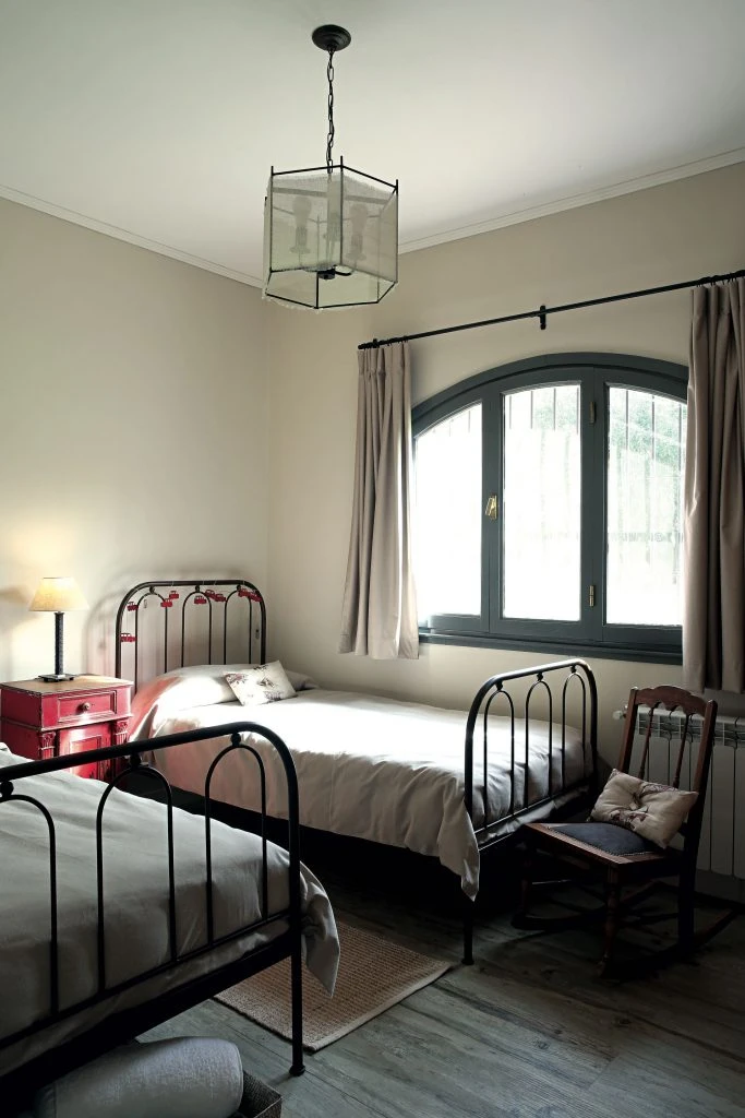 El cuarto infantil de los varones logra una apariencia net con camas de hierro pintadas de negro (Agustina Cerato) y vestidas en el mismo género beige de Ernesto Canovas que se usó para las cortinas. La mesa de luz reciclada y la pantalla colgante de hierro y gasa (ambas de Lo de Berni), junto con la alfombra de yute comprada en Tigre y la mecedora retapizada en azul le dan un aire de antaño a la composición.
