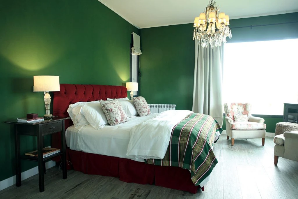 La suite principal ratifica su britishstyle en el tono verde que la decoradora eligió para sus paredes y que ofrece el contraste perfecto del respaldo capitoné y su cubresommier en terciopelo lacre. La ropa de cama es importada: las sábanas y mantas se trajeron de Inglaterra y el pie de cama, de Birmania. Dos mesas de luz de caoba (Kenya), con veladores de cristal con pantallas de lino blanco, se plantan a cada lado sobre los pisos de porcellanato símil madera decapé (www.barugelazulay.com.ar). En un ángulo, un rincón de lectura se arma con una salamandra, una mesa de mimbre patinado y un par de sillones renovados con géneros de Manuel Canovas formando composé .