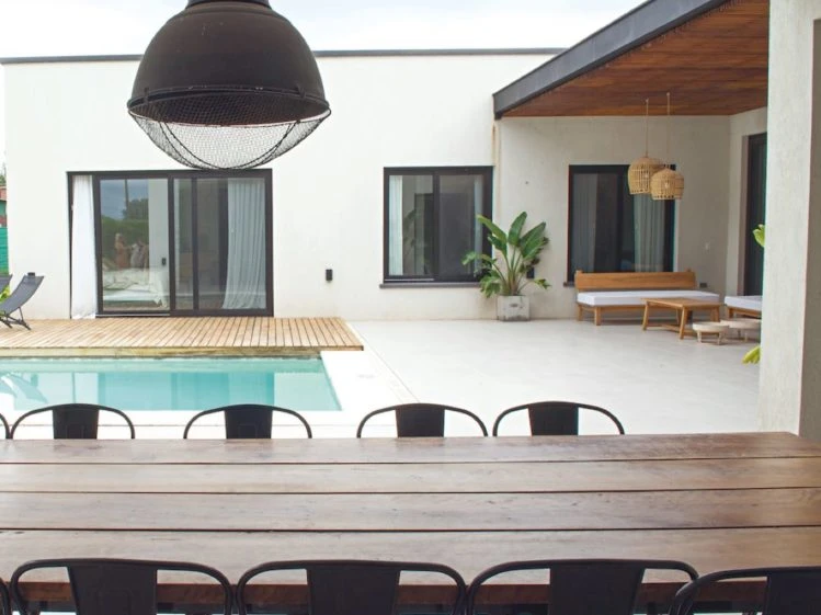 El diseño llevado a cabo por el arquitecto Juan Martín Roldán (@arq.juanroldan) con la colaboración de Sofía Pérez Brea (@cheardecasa) en la decoración, ubica la pileta en el centro de la casa y le da a la galería/quincho un uso central todo el año.